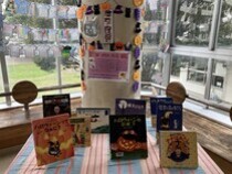 月が替わり、図書ラウンジも新たな本を紹介しています。10月に行われるハロウィンに合わせて「魔法使い、おばけ」が出てくるお話、全ての子供たちに本を読むことの楽しさや喜びを体験してもらうために設置された「リンゴの棚」を紹介しています。家庭でも、学校で読んだ本について話題にしてみてください。